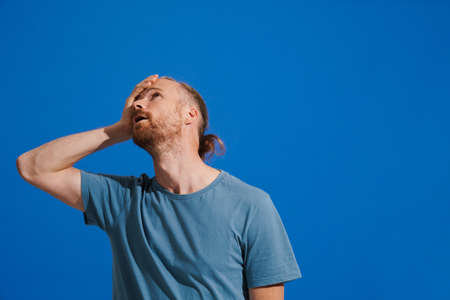 Ginger puzzled man holding his head while looking upward isolated over blue background