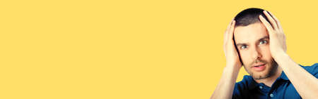 Portrait image of unhappy shocked panic man, over yellow background. Emotions and unsuccessful. Excited male model with rise up hands, blue casual clothing at studio.