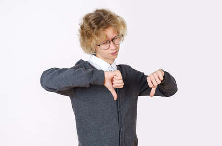 Teen boy showing with hand gesture is bad. Isolated over white background.