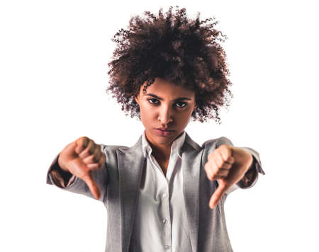 Beautiful young Afro American business woman in formal wear is showing thumbs down and looking at camera, isolated on white