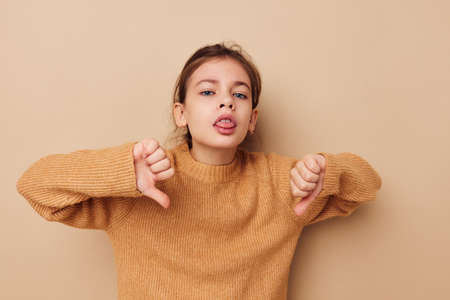 Sad dissatisfied redhead girl showing thumbs down sign with her fingers.