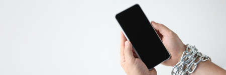 Young man have social media addiction. addiction from laptop or smartphone. Holding phone in hands. Chains around wrist. Black screen.