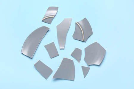 Pieces of broken ceramic plate on light blue background, flat lay