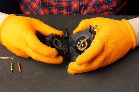 laptop fan in hand on dark background. computer service and repair concept. close-up