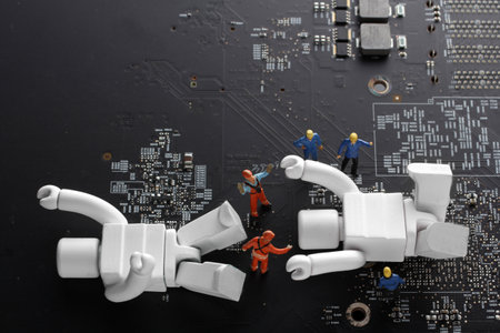 Top view of hands of man repairing electronic devices on white background, Aerial view of hands with computer electronics parts on a white background, AI Generated