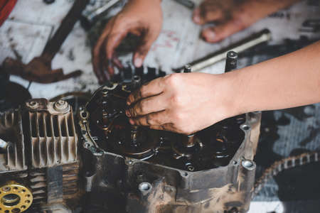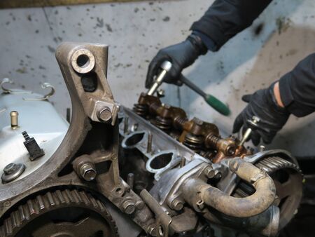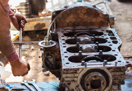 Mechanic opened the locking valve mechanism. Disassemble engine block vehicle. Old motor capital repair. Car service concept
