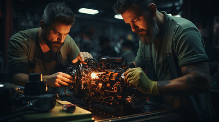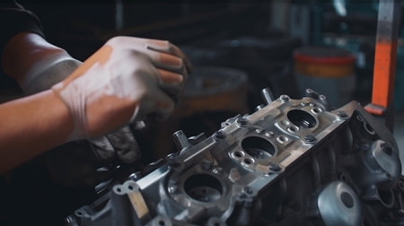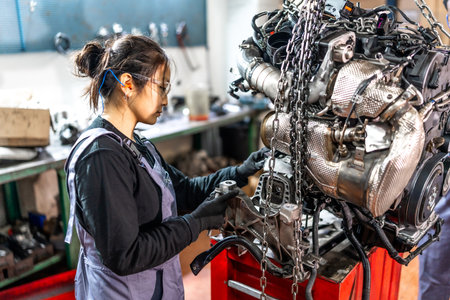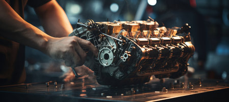 A modern diesel engine, staff hands, and a tool are being repaired. A auto mechanic examines the engine in a maintenance repair service center to analyze the vehicle's symptoms, Generative AI