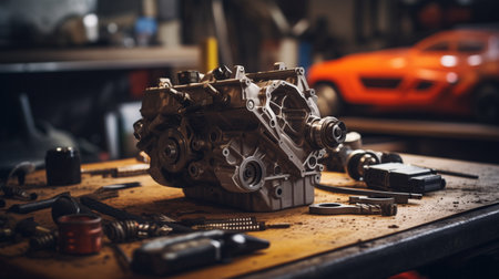 a close-up of an old car engine in a garage, with tools and parts scattered around, created with generative ai