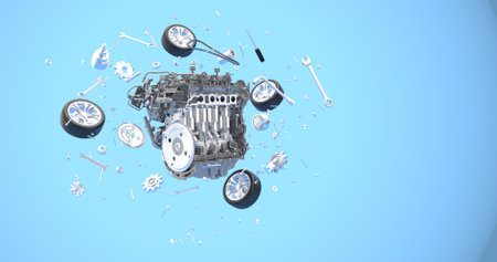 3d rendering of a car engine on a blue background with a lot of tools
