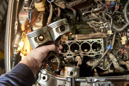 A man holds a piston of a car against the background of an engine, car repair process.