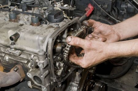 Repairing of diesel engine close up of worker hands