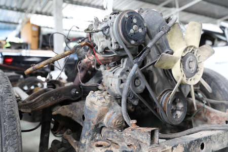 Disassembled car vehicle , four-cylinder engine for repair.