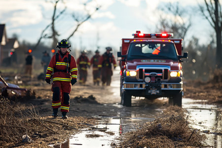 Firefighter strides through debris-littered road after a tornado, with emergency vehicle in the background.