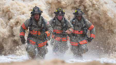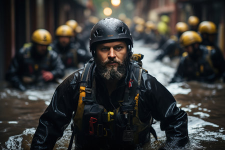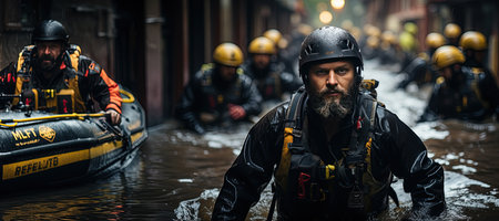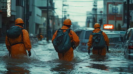 Emergency responders wade through deep floodwater in urban streets, illustrating their dedication and teamwork during a severe weather event while emphasizing safety.