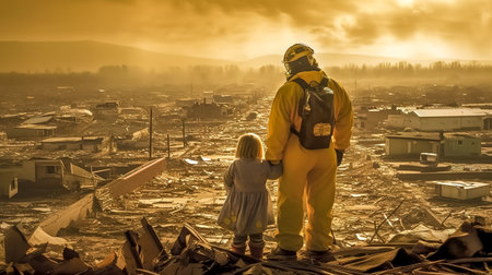 volunteer firefighter with a child looking at the destroyed city, natural elements and the war, made with Generative AI