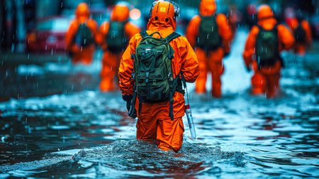 Emergency responders in bright orange gear are walking through flooded streets, showing their commitment to safety and rescue efforts.