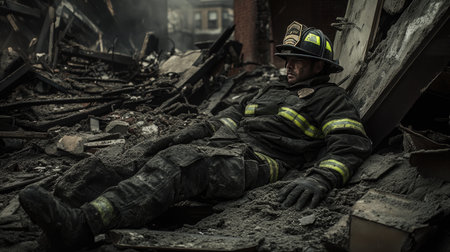 A fireman rests on the debris of a collapsed building, worn out and somber, after a heroic effort in a tragic scene.