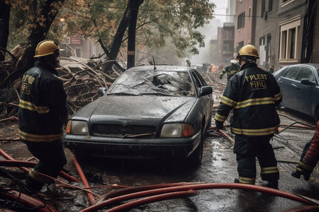 Back view of firefighters helping to clear fallen trees off cars in the aftermath of a stormy, rainy day. Generative AI
