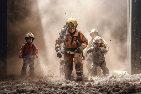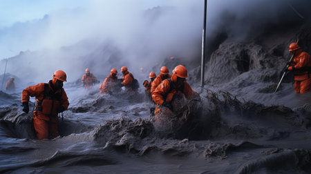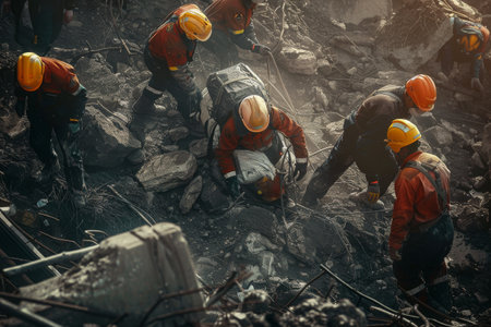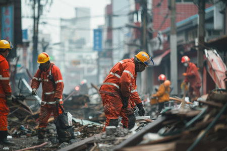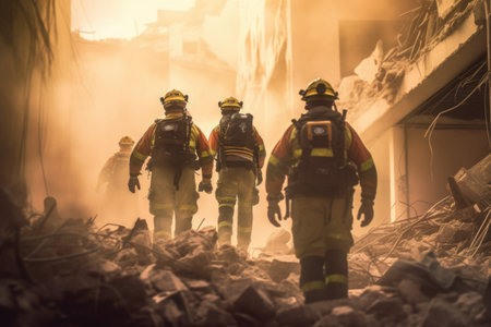 a group of rescue workers in orange uniforms navigate through debris at a disaster site. Their focus and teamwork highlight the importance of emergency response efforts. ai generated.