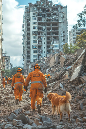 Rescue team in bright orange uniforms navigates rubble from a collapsed building with a loyal search dog. The sky is partly cloudy, and the destruction looms behind them as they proceed cautiously.