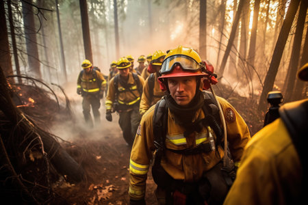 Firefighters battling forest fire. Natural disaster accident. Generative AI