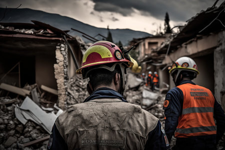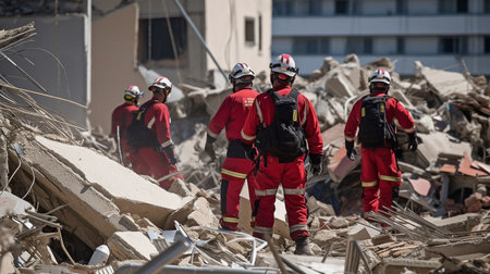 Rescue workers sift through rubble after a disaster, with focus and determination amid the devastation.