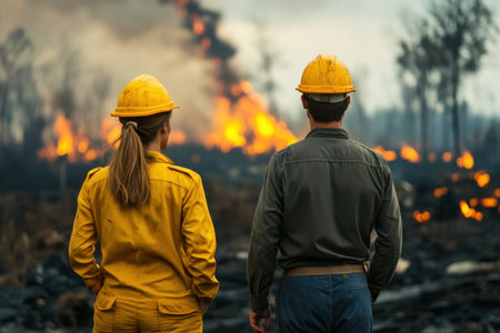 Firefighters in protective gear surveying the damage after a forest fire, with smoldering debris and burned trees in the background.