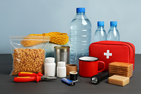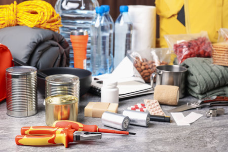 Disaster supply kit for earthquake on grey table indoors