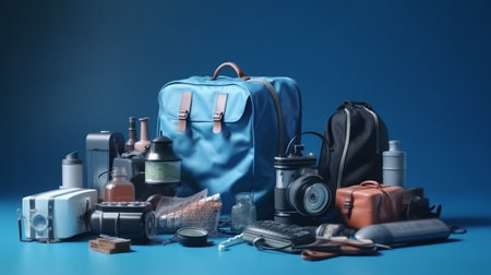A travel first aid kit, a minimum set of medicines for the trip, a black backpack on the floor, a travel bag, a mini first aid kit. High quality photo
