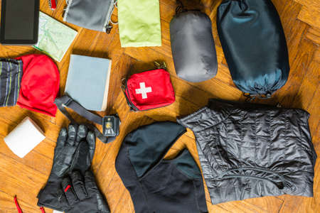 Hiking equipment tidy to put it in the backpack. Knolling hiking