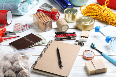 Necessities for emergency bag on white table