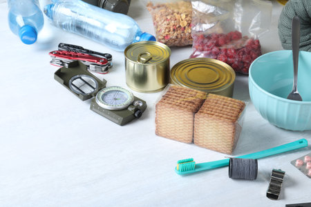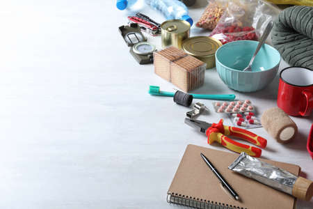 Survival kit. Different emergency supplies on light table, closeup