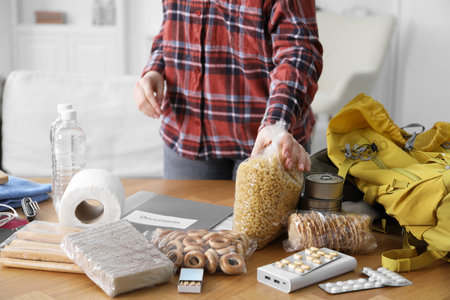 Survival kit. Woman packing different emergency supplies at wooden table indoors, closeup
