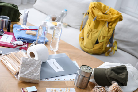 Emergency backpack equipment organized on the table in the living room