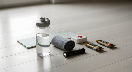 Aerial view of emergency backpack preparations with necessities
