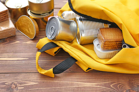 Schoolbag with different products on wooden background. Concept of Backpack Food Program