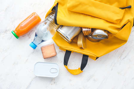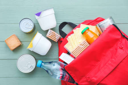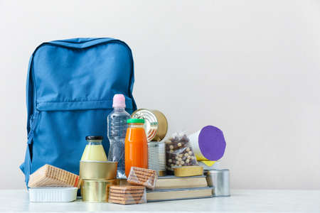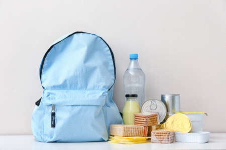 Schoolbag with different products on table. Concept of Backpack Food Program