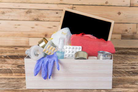 Disaster supply kit for earthquake on white wooden table