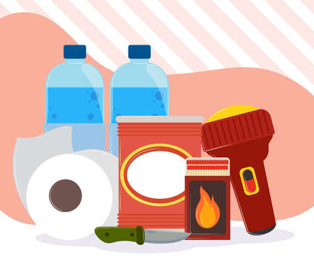 Set of food essentials to emergency, drinking water, with copy space