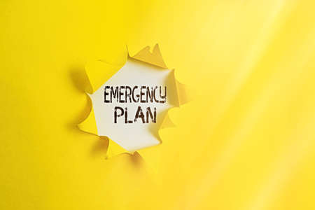 Emergency plan message written on torn torn orange paper piece with gray background. Conceptual emergency plan symbol. Copy space.