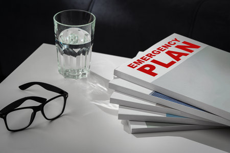 Preparing for safety with an emergency plan and glasses beside a glass of water