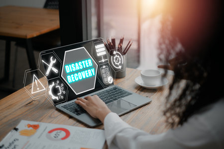 Disaster recovery concept, Buinesswoman using laptop computer on desk with disaster recovery icon on virtual screen.