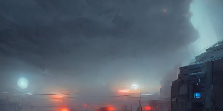Abstract city backdrop with thunderstorm and mock up place. Weather and dramatic nature concept