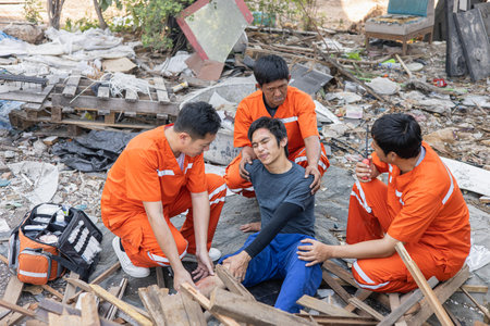 paramedic medical emergency team working help labor accident at dirty construction site leg injury painful tetanus risk