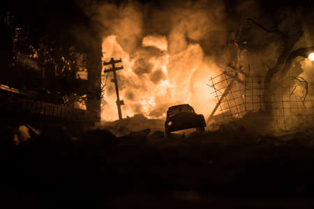 Empty street of burnt up city, flames on the ground and blasts with smoke in the distance. Apocalyptic view of city downtown as disaster film poster concept. Night scene. City destroyed by war.