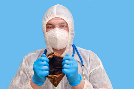 Man doctor medic in a protective suit uniform with goggles and face mask on a studio blue background. Paramedic in white antiviral protective clothing wearing an N95 respirator and safety glasses
