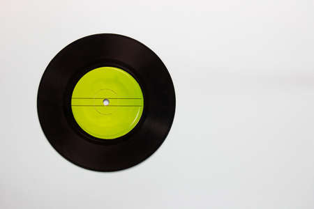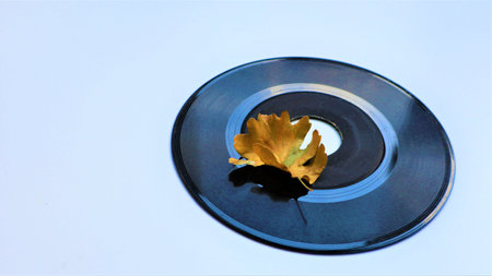 autumn composition. Black musical long play album disc 33 rpm. old technology, realistic retro design. 45 rpm vinyl vintage pop record with autumn leaves.