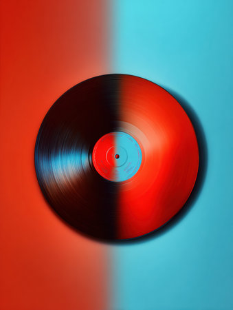 A vinyl record with a striking color gradient sits against a bright red and blue background, highlighting the retro appeal of music and art.