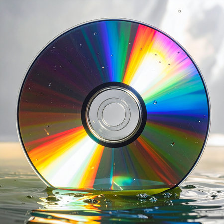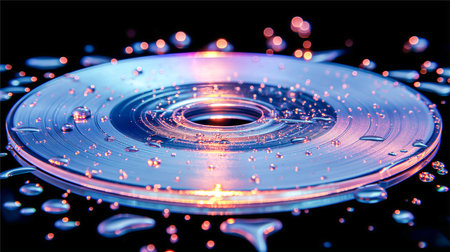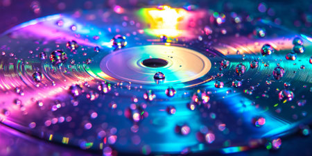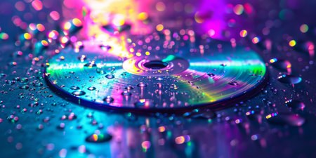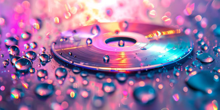 Macro shot of a compact disc with colorful light refraction and water drops.