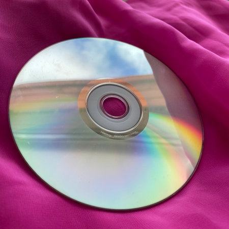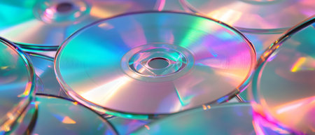 Exploring the intricate textures and reflective surfaces of compact discs in vibrant light